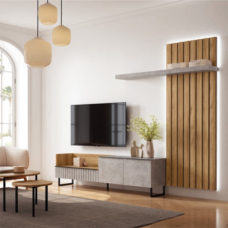 Composición Soma 3 Los paneles decorativos se pueden hacer en cualquier color, barras y trasera así como la iluminación. Acabados: Nature / Cemento Satén / Gris