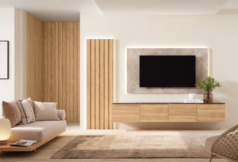 Composición Soma 1 El panel de TV de madera integrado en el mueble es mucho más que un simple soporte para la pantalla. Acabados: Quercus / Caliza Aliso / Marfil / Picasso