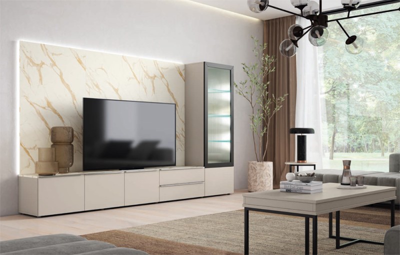 Composición Soma 7 Combinación madera y vidrio, para transmitir una sensación de sofisticación. Acabados: Marfil / Aurum / Negro poro Fumé / Caliza