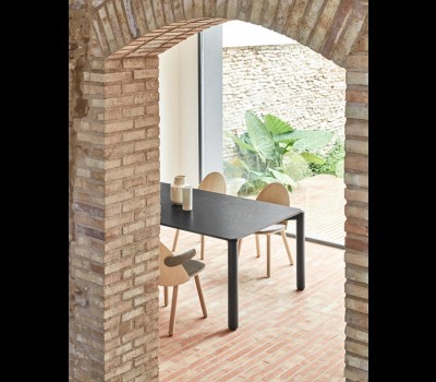 La mesa rectangular Atlas presenta 4 patas con un ligero desfase y rematadas con un pie redondeado, las cuales dan soporte al tablero rectangular.